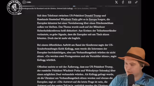 01:07:17Der US-Sondergesandte Kellogg hat bei der Münchner Sicherheitskonferenz klare Worte gesprochen: Die EU soll bei zukünftigen Ukraine-Verhandlungen nicht mitreden dürfen. Kellogg erklärte, dass nur Trump, Putin und Selensky über einen möglichen Deal verhandeln werden. Die Interessen der Europäer würden zwar berücksichtigt, sie sollten aber nicht am Verhandlungstisch sitzen. Diese Positionierung wurde von den meisten europäischen Staaten und der Ukraine als inakzeptabel zurückgewiesen.