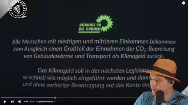 01:48:00Der Emissionshandel ist ein zentrales Klimapolitikinstrument in Europa, bei dem Firmen Zertifikate für CO2-Emissionen erhalten. Wer mehr emittiert, muss weitere Zertifikate kaufen, wer weniger emittiert, kann überschüssige verkaufen. Der CO2-Preis ist jedoch zu niedrig wirkungsvoll zu sein. Sozialer Ausgleich ist wichtig - SPD, Grüne und FDP diskutieren Klimageld oder Klimadividende, um Belastungen für Haushalte auszugleichen.