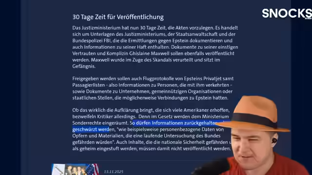 00:48:07US-Präsident Trump hat das Gesetz zur Freigabe der Epstein-Akten unterzeichnet, nachdem der Druck aus seiner eigenen Partei zu groß geworden war. Dies ermöglicht die Veröffentlichung von Justiz-Akten im Fall des verstorbenen Sexualstraftäters Jeffrey Epstein. Das Gesetz wurde zuvor einstimmig vom Senat und mit überwältigender Mehrheit vom Repräsentantenhaus gebilligt. Es sollen Flugprotokolle von Epsteins Privatjets, Passagierlisten sowie Informationen zu Personen, Unternehmen, gemeinnützigen Organisationen und staatlichen Stellen, die Verbindungen zu Epstein hatten, freigegeben werden. Kritiker bezweifeln jedoch, ob dies die erhoffte vollständige Aufklärung bringen wird, da das Justizministerium Sonderrechte erhält, Informationen zurückzuhalten und zu schwärzen. Es wird vermutet, dass Trump versuchen wird, die Veröffentlichung zu manipulieren, wie es von ihm erwartet wird. Die politische Sprengkraft des Falls ist enorm, da Trump vor seinem Wahlsieg versprochen hatte, die Akten vollständig offenzulegen, dieses Versprechen jedoch nicht eingelöst hatte. Seine Argumentation, dass Epstein hauptsächlich Kontakte zu Demokraten hatte, wird als unklug und widersprüchlich angesehen, da Trump selbst vor 2016 den Demokraten nahestand.