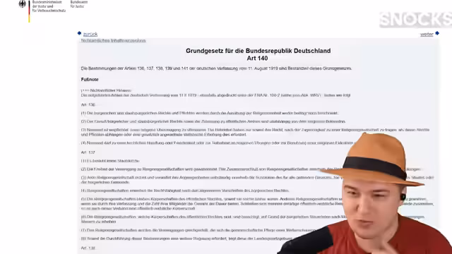 01:52:14Es wird die juristische Verfassungssituation von Staat und Kirche in Deutschland beleuchtet. Zwar gibt es im Grundgesetz die Religionsfreiheit und faktisch eine Trennung, jedoch werden der Kirche laut dem Streamer erhebliche Privilegien eingeräumt. Diese Sonderstellung manifestiert sich in Verträgen wie den Konkordaten, die eine einzigartige Behandlung sichern. Die Kirche kann eigene Gesetze erlassen und profitiert von einer Kooperation mit dem Staat, was wiederum die politische Einmischung der Kirche in gesellschaftliche Themen ermöglicht.