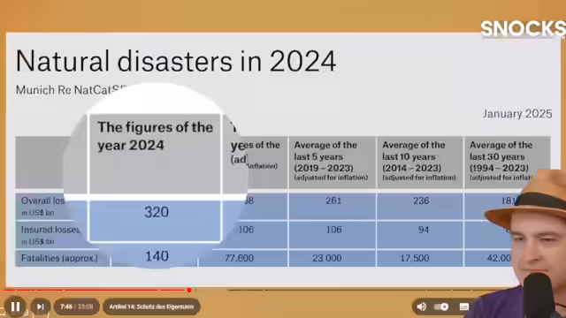 01:53:49Mit Blick auf Art. 14 GG, der den Schutz des Eigentums garantiert, wird die zunehmende Bedrohung durch die Klimakrise thematisiert. Die Warnungen der Münchner Rückversicherung über exorbitant ansteigende Schäden durch Naturkatastrophen (2024: 320 Milliarden US-Dollar weltweit) dienen als Beleg. Für Deutschland werden die Klimafolgeschäden auf bis zu 900 Milliarden Euro bis 2055 geschätzt. Der Streamer zweifelt daran, dass die geplanten Maßnahmen des Koalitionsvertrags ausreichend sind, um dieses massive Schadenspotenzial abzuwenden.