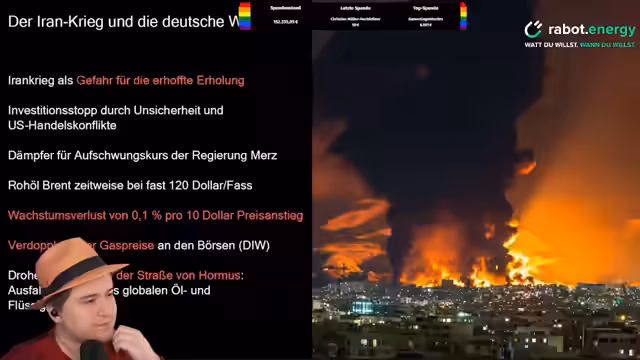 03:50:25Konflikte im Nahen Osten sind primär durch wirtschaftliche Interessen, insbesondere Rohstoffe wie Öl und Gas, getrieben. Die aktuellen Spannungen führen zu einer Ölpreis-Rallye, wobei die Sorte Brent zeitweise auf fast 120 US-Dollar pro Fass stieg. Jeder Anstieg des Ölpreises um 10 Dollar senkt das Wirtschaftswachstum in Industriestaaten um 0,1 Prozent. Deutschland, obwohl weniger abhängig von fossilen Energieträgern als 2022, ist dennoch durch die globalen Marktpreise betroffen. Der Krieg im Nahen Osten dämpft das prognostizierte Wirtschaftswachstum in Deutschland für 2026 um 0,1 bis 0,2 Prozentpunkte.