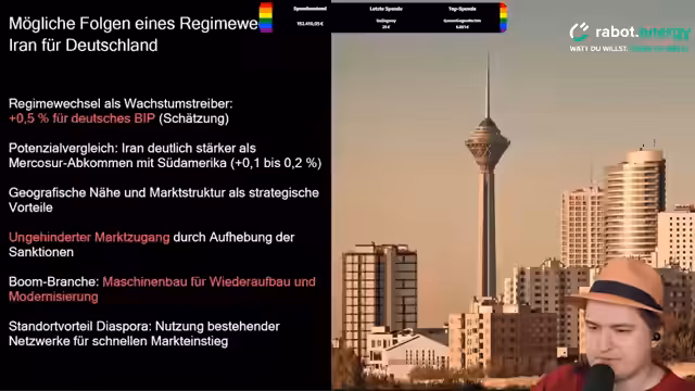 04:12:06Ein Regimewechsel im Iran könnte potenziell positive wirtschaftliche Folgen für Deutschland haben, sofern das Land zu einer demokratischen und offenen Regierung wird. Experten wie Gabriel Felbermayr schätzen, dass ein solcher Wandel das deutsche Wirtschaftswachstum um bis zu 0,5 Prozentpunkte beschleunigen könnte. Dies wäre auf eine mögliche Aufhebung von Sanktionen und einen verbesserten Marktzugang für deutsche Unternehmen, insbesondere im Maschinenbau, zurückzuführen. Jedoch ist dieses Szenario höchst spekulativ und von vielen Faktoren abhängig.
