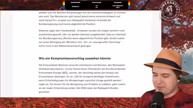 00:35:35Die geplante Redispatch-Regelung des Wirtschaftsministeriums, die die Vergütung für Erneuerbare in Netzenspargesgebieten drosseln will, wird scharf kritisiert. Aus Koalitionskreisen und von den Grünen kommt die Befürchtung, dass dies Investition hemmt und den Ausbau verlangsamt. Ein Twitter-Kollege wird zitiert, der argumentiert, dass Akkuspeicher für eine Stadt zu groß seien, was der Streamer als nicht nachvollziehbar zurückweist.