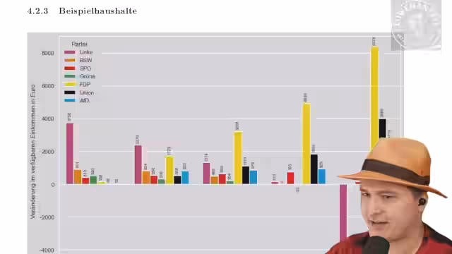 00:54:35Es wird eine Auswertung des ZEW Mannheim zu den finanziellen Auswirkungen der Reformvorschläge verschiedener Parteien (SPD, CDU, Grüne, FDP, AfD, Linke, BSW) in Bezug auf Einkommensteuer, Soli, Vermögensteuer, Bürgergeld, Mindestlohn und Klimageld vorgestellt. Der Streamer betont, dass er alle Seitenangaben aus den Wahlprogrammen überprüft hat und diese korrekt waren. Er geht auf die absoluten Zahlen ein und kritisiert die AfD dafür, dass ihre Politik den einkommensschwächsten Haushalten nicht zugutekommt. Die FDP wird dafür kritisiert, dass sie die Ärmsten benachteiligt, während die Grünen und die Linke eine stärkere Belastung der Reichen befürworten. Der Streamer äußert sich zuversichtlich, dass er auch bei höheren Steuerbelastungen finanziell gut dastehen würde. Abschließend wird betont, dass die präsentierten Zahlen die Auswirkungen zeigen, wenn eine Partei alleine die absolute Mehrheit hätte und ihre Pläne vollständig umsetzen könnte.