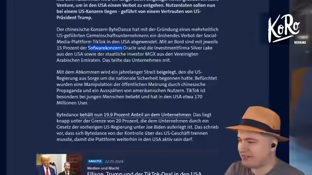00:53:53Anknüpfend an die Ukraine-Thematik diskutiert der Streamer die Entwicklung des US-amerikanischen Drucks auf Grönland und die Absage von Strafzölen gegen Europa. Dies wird als Scheitern von Trumps maximalistischer Strategie interpretiert. Ein weiteres wichtiges Thema ist die Ablenkung des TikTok-Verbots in den USA, bei dem das Unternehmen nun teilweise unter die Kontrolle von Trump-Verbündeten wie Oracle und US-amerikanischen/arabischen Investoren gestellt werden soll. Der Streamer sieht dies als besorgniserregende Entwicklung für die Unabhängigkeit der Plattform.