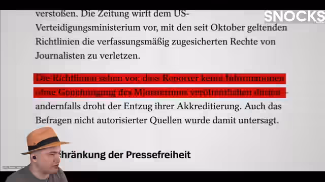 01:08:36Trump hat einen Krieg gegen die Medien erklärt und ist damit erfolgreich. Er lässt große Nachrichtenagenturen aus dem Presseraum des Weißen Hauses fliegen, will Artikel des Pentagons vorab genehmigt wissen und hat die Pressefreiheit in den USA drastisch sinken lassen. Parallelen zum Aufstieg von Autokraten sind unübersehbar. Simplicissimus hat ein Video dazu produziert. Der Streamer war gespannt auf die Darstellung.