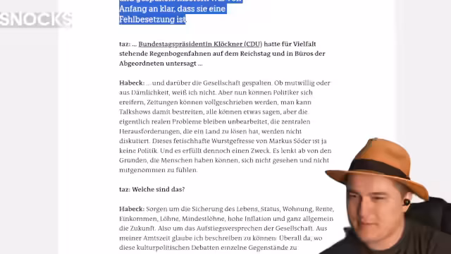 01:42:46Der Streamer zitiert aus einem Video von Robert Habeck, in dem dieser seinen Rückzug aus dem Bundestag zum 1. September verkündet. Habeck begründet diese Entscheidung damit, dass er einen Weg gehen möchte, der nicht den Erwartungen der Öffentlichkeit entspricht, und möchte nicht als ständige Besserwisserin oder Gespenst der Vergangenheit in der Politik erscheinen. Er zitiert Habeck, der betont, dass er sich aus dem Berliner Politikbetrieb verabschieden, um neue Ideen zu entwickeln und von außen auf Deutschland zu schauen, und gibt an, künftig in Forschungsinstituten in Kopenhagen und Berkeley tätig zu sein.