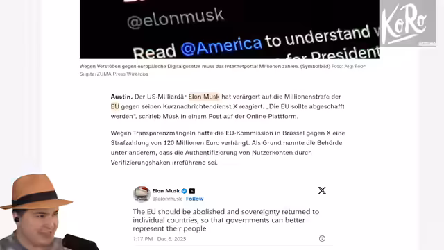 00:46:43Elon Musk reagiert verärgert auf eine Millionsstrafe der EU gegen X (Twitter) wegen Transparenzmängeln (irreführende Nutzerverifizierung) und fordert die Abschaffung der EU. US-Politiker wie Marco Rubio unterstützen ihn und werfen der EU vor, US-Tech-Plattformen anzugreifen. Der Streamer kritisiert Musks Heuchelei: Unter seiner Führung erhöhte sich die Zensur auf X massiv (z.B. in der Türkei oder Indien). Die EU-Strafe wird als berechtigt verteidigt – Transparenzpflichten seien notwendig, während die USA gleichzeitig militärischen Schutz durch Europa erwarten.