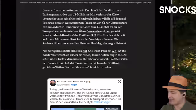 04:24:56Es wird gewarnt, dass die USA mit dem Kapern eines Öltankers vor Venezuela versuchen, einen Vorwand für einen Angriffskrieg zu schaffen. Diese Provokation sei ultra-transparent. Senator Rand Paul wird zitiert, der von Trumps Ruf als Friedenspräsident ironisch distanziert. Trumps Äußerungen, Venezuela angreifen zu wollen, um Maduro loszuwerden, werden ebenfalls angesprochen. Die Annexion von Grönland wird als weiteres aggressives Ziel erwähnt.