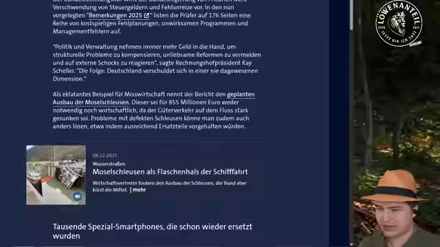 01:14:41Der Deutsche Rechnungshof hat die Bundesregierung wegen ihrer Finanzpolitik hart kritisiert. Präsident Kay Scheller warnte vor einer nie dagewesenen Verschuldung Deutschlands. Als eklatantes Beispiel für Misswirtschaft nannte der Bericht den geplanten Ausbau der Moselschleusen, der für 58 Millionen Euro weder notwendig noch wirtschaftlich sei. Weitere Kritikpunkte umfassten die Beschaffung unbrauchbarer Zoll-Smartphones für 35 Millionen Euro und milliardenschwere IT-Projekte, die im Blindflug umgesetzt werden.