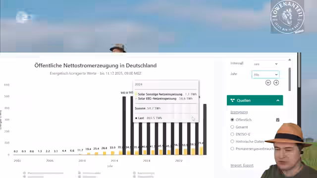 02:35:20Der Stream behandelt die Komplexität des deutschen Stromverbrauchs, die durch Selbstverbrauch ansteigt, aber durch wachsende Elektromobilität und Wärmepumpen neuen Herausforderungen ausgesetzt ist. Eine Reduktion des Stromverbrauchs wird infrage gestellt, da die Last trotz Einsparungen teilweise wieder gestiegen ist. Die EU wird als entscheidender Akteur genannt, der durch den Zusammenschluss der Stromnetze der Mitgliedstaaten eine Lösung anstreben muss, um die Versorgungssicherheit zu gewährleisten.
