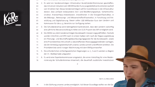 00:26:48Der Streamer analysiert die Sondierungsergebnisse zwischen SPD und Union und kommt zu dem Schluss, dass eine schwarz-blaue Regierung äußerst unwahrscheinlich ist. Er kritisiert das Sondierungspapier, insbesondere das geplante Sondervermögen über 500 Milliarden Euro und die Kippen der Schuldenbremse. Der Streamer äußert Bedenken bezüglich der Umsetzung dieser Maßnahmen und fragt, ob die Grünen davon profitieren werden. Er geht auch auf die Position der Grünen zur Kernkraft ein und stellt fest, dass diese weiter von einer Zustimmung zu einer Grundgesetzänderung entfernt sind als zuvor.
