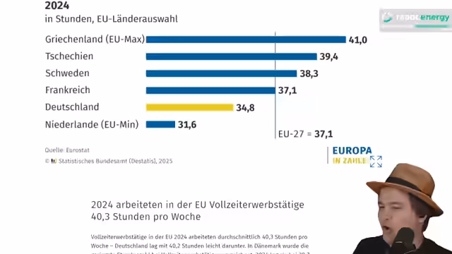 00:45:05Der Streamer thematisiert eine Aussage von Wirtschaftsministerin Katharina Reiche, die eine Erhöhung der Lebensarbeitszeit in Deutschland fordert. Begründet wird dies mit demografischem Wandel und steigender Lebenserwartung. Die Kritik aus der eigenen Partei und von Sozialverbänden wird präsentiert, die eine Anhebung des Renteneintrittsalters vermeiden will. Die internationalen Vergleichswerte zur geleisteten Arbeitszeit werden als Indikator für eine mangelnde Wettbewerbsfähigkeit Deutschlands genannt.