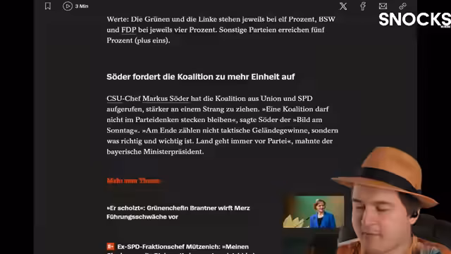 00:36:30Der Streamer diskutiert eine aktuelle Umfrage, der zufolge 49% der Befragten ein vorzeitiges Ende der Koalition erwarten, während nur 33% davon ausgehen, dass sie die Legislaturperiode durchhalten wird. Die Regierungszufriedenheit liegt bei 25% mit einem Minus von 3 Prozentpunkten. Der Streamer äußert seine Skepsis bezüglich eines möglichen Kurses der FDP und kommentiert die aktuelle politische Lage, insbesondere die Positionen der Union und der SPD.