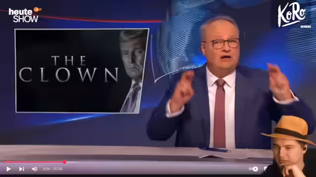 03:44:00Donald Trumps internationaler Besuch in England und der Umgang mit der britischen Königsfamilie wird als erniedrigend und "bösartiges Riesenbaby bei Laune halten" kritisiert. Auf einem Bild, das ihn mit einem Pferd zeigt, reagiert das Tier negativ auf ihn, was symbolisch gewertet wird. Seine bisherige Regierungspraxis, die unabhängige US-Medienaufsicht zu instrumentalisieren, wird als Putin- und Erdogan-gemäß kritisiert, während Melania Trumps öffentliches Auftreten in luxuriösen Kostümen das Bild des Präsidenten kontrastiert.