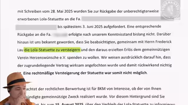 02:59:42Das dritte Verfahren behandelt einen PR-Stunt, bei dem der Streamer gefälscht Preise wie ein Echo, das Bundesverdienstkreuz und den deutschen Filmpreis erhielt. Trotz Rückgabeveruchen verblieb die Lola-Statuette beim Filmemacher Frederik Laudy, mit dem er sie für 3.600 Euro an Herzenswünsche e.V. versteigerte. Das Kulturministerium forderte später die Statue zurück und beanstandete den Verkauf, obwohl ein Rückgabedrange bestand. Alle Versuche, die Auszeichnungen zurückzugeben, scheiterten.