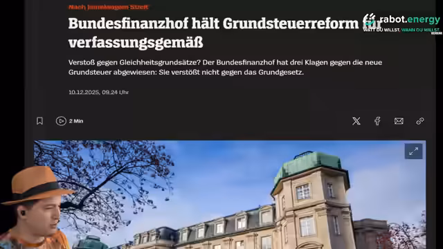 01:00:44Der Bundesfinanzhof hat ein Urteil zur Grundsteuer gefällt, das eine Neubewertung von Grundstücken betrifft. Besonders kontrovers ist, dass nicht nur das Haus, sondern auch unbebaubare Flächen wie Zufahrtswege oder hinterliegende Grundstücke gleich hoch besteuert werden. Über 2,8 Millionen Eigentümer haben Einspruch eingelegt. Kritisiert wird, dass Flächen, die man weder bebauen noch sinnvoll nutzen kann, steuerlich gleich behandelt werden wie bebaubare Areale. Der Streamer äußert Skepsis gegenüber pauschalen Lösungen, da es viele Sonderfälle gebe, historisch bedingte Nutzungsbeschränkungen und individuelle Umstände, die eine differenzierte Betrachtung erfordern.