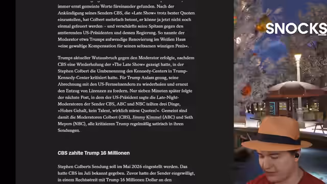 00:57:28Trump fordert öffentlich, CBS solle den Satiriker Stephen Colbert "einschläfern", nachdem Colbert wiederholt Trump kritisiert hatte. Colbert antwortete sarkastisch und verwies auf seine besseren Quoten. Der Streamer kritisiert Trumps "fragiles Ego" und vergleicht die Medienübernahme durch Trumps Verbündete mit Putins Strategie. Er warnt vor möglichen Gewaltaufrufen gegen Kritiker und betont, dass solche Äußerungen ein Armutszeugnis für die US-Demokratie sind.
