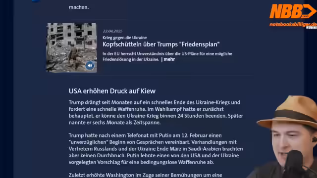 00:47:40Die Entwicklung im Ukraine-Krieg wird diskutiert, wobei der Fokus auf Donald Trumps gescheiterten Versuchen liegt, die Ukraine zur Aufgabe der Krim zu drängen. Zelensky weigert sich, die Krim aufzugeben, was Trump wütend macht und zu der Anklage führt, die Ukraine wolle keinen Frieden. Trumps Behauptung, den Krieg binnen 24 Stunden beenden zu können, wird als unglaubwürdig entlarvt. Europäische Partner lehnen Trumps Vorschlag als Kapitulationsurkunde ab.