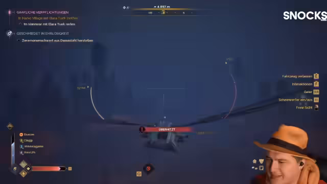 03:36:49Es wird eine Gilde als dekoratives Element vorgestellt, die aber angepasst werden muss. Spieler werden in eine Basis eingeladen, in der sie Waffen testen und sich mit dem Kampfsystem vertraut machen können. Die Basis ist mit Rüstungen ausgestattet, um den Spielern einen Vorteil zu verschaffen. Drakon hat die Basis vorbereitet, um ein entspanntes Spielerlebnis zu ermöglichen, inklusive der Möglichkeit, Ressourcen abzubauen und NPCs zu bekämpfen. PvP-Erfahrungen waren bisher weniger erfolgreich, da der Streamer eher abgeschossen wurde als andere zu besiegen, wobei er sich in einem Fall erfolgreich verteidigen musste, aber sein Flugzeug zerstört wurde. Racco kommt mit einer Libelle vorbei, aber es gibt technische Probleme. Sandstürme im Spiel können zufällig auftreten und die Haltbarkeit von Flugzeugen reduzieren, was dazu führt, dass man sie vermeiden sollte. Das Spiel ist aktuell als Free-to-Play-Wochenende verfügbar, und der Fortschritt kann beim Kauf des Spiels übernommen werden.