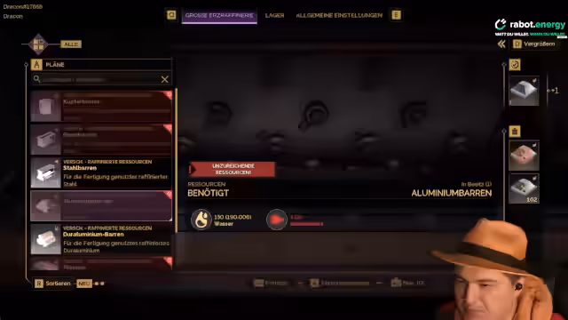 04:04:57Es wird überlegt, ein Typ 4 Flugzeug zu bauen, da dafür Aluminium benötigt wird. Die Hauptstädte sollen gezeigt werden. Es wird eine Riesenbox aufgestellt, in der die Spieler ihren Loot zwischenlagern können. Es wird festgestellt, dass die Spieler auch Boxen in ihren Zimmern haben. Die Zimmer werden als 50 Quadratmeter große Zellen für 900 Euro Miete im Berliner Stil beschrieben. Es wird überlegt, Fenster einzubauen und die Farbauswahl zu verbessern. Die Spieler haben einen Cutter-Ray im Inventar, mit dem sie Ressourcen sammeln können. Es wird gezeigt, wie Aluminium-Erz aussieht. Es wird festgestellt, dass die Spieler den falschen Cutter-Ray in der Box haben. Es wird erklärt, wie man den Cutter-Ray ausrüstet. Es wird gezeigt, wie Aluminium abgebaut wird. Es wird erklärt, dass man die abgebauten Ressourcen entweder in die Box legen oder verarbeiten kann. Es wird erklärt, dass die großen Verarbeitungsanlagen effizienter sind. Es werden Scouts für die Spieler gebaut. Aluminium wird als wichtigste Ressource identifiziert. Der Streamer geht Aluminium sammeln.