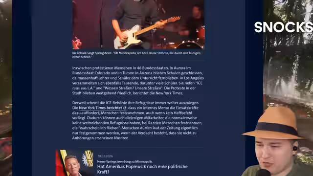 01:09:09Es wird über Proteste in Minneapolis berichtet, an denen auch der Musiker Bruce Springsteen teilnahm, der einen Protestsong spielte. Parallel dazu finden in 46 Bundesstaaten Proteste unter dem Motto 'Shutdown ICE' statt. Die New York Times berichtet, dass ICE intern seine Befugnisse auslegt und zu Festnahmen ohne Haftbefehl aufruft. In der Region um Minneapolis wurden 3000 ICE-Mitarbeiter eingesetzt, was der örtlichen Polizei um ein Fünffaches überlegen ist. Die Proteste wurden als weitgehend friedlich beschrieben.