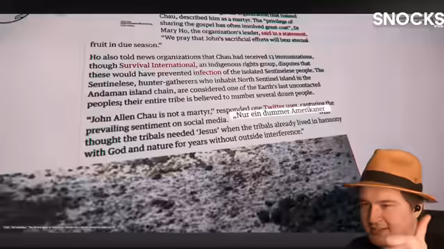 02:50:17John, ein christlicher Missionar, nahm an einem geheimen Bootcamp der religiösen Organisation All Nations teil, um sich auf seine Mission auf North Sentinel Island vorzubereiten. Trotz der bekannten Gefahren und des klaren Widerstands der Sentinelesen, die jeden Eindringling abwehren, war John fest entschlossen, die Insel zu betreten. Er sah North Sentinel als die 'letzte Hochburg Satans' und sich selbst als ihren Retter. Im November 2018 bestach er indische Fischer, um ihn zur Insel zu bringen. Bei seinem ersten Versuch wurde er von einem Jungen mit einem Pfeil beschossen, der angeblich nur seine Bibel durchbohrte. John deutete dies als Zeichen und versuchte es am nächsten Tag erneut, diesmal ohne die Fischer und nur in Unterhose, um Vertrauen zu gewinnen. Es gibt keine Aufzeichnungen über die genauen Ereignisse dieses Tages, aber die Fischer fanden am Tag darauf Johns Leiche, die von einer Gruppe Sentinelesen durch den Sand geschleift wurde. Sein Tod machte weltweit Schlagzeilen. Während einige ihn als 'dummen Amerikaner' oder 'verblendeten Idioten' bezeichneten, sah ihn die evangelikale Organisation, die ihn ausgebildet hatte, als Märtyrer, dessen 'Privileg, das Evangelium zu verkünden, häufig einen hohen Preis gefordert' habe. Johns Vater hingegen machte den fanatischen evangelikalen Glauben für den Tod seines Sohnes verantwortlich und bezeichnete Religion als 'Opium der Massen'.