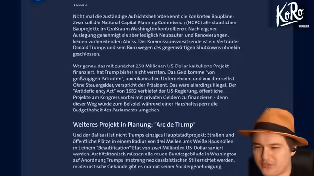 00:41:07Donald Trump sorgt erneut für Kontroversen, indem er den Ostflügel des Weißen Hauses abreißen lässt, um einen Ballsaal zu bauen, der doppelt so groß wie das Weiße Haus selbst sein soll. Konservatoren und Traditionalisten sind empört, da dies als destruktiv und respektlos gegenüber der Geschichte angesehen wird. Die Regierungsssprecherin verteidigt das Projekt als mutig und notwendig, da Präsidenten seit 150 Jahren einen größeren Veranstaltungsraum wünschen. Es wird vermutet, dass Trumps Motivation eine persönliche Entkränkung durch Barack Obama sein könnte, der seinen früheren Vorschlag ignorierte. Das Projekt wird ohne öffentliche Mitbestimmung oder Kenntnis der Baupläne durch die zuständigen Aufsichtsbehörden vorangetrieben, was von Denkmalschützern scharf kritisiert wird. Die Finanzierung des 250 Millionen US-Dollar teuren Projekts durch private Gelder von 'großzügigen Patrioten' und Unternehmen wird als illegal angesehen, da der Anti-Defficiency Act von 1982 die Finanzierung öffentlicher Projekte am Kongress vorbei mit privaten Geldern verbietet. Dies würde die Budgethoheit des Parlaments umgehen und ist ein weiteres Beispiel für Trumps umstrittene Bauprojekte, die die USA in den Augen vieler zu einer 'Satire-Land' machen.