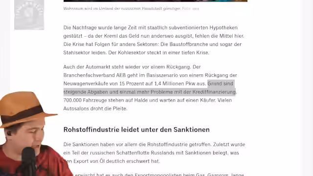 00:32:24Der Streamer untersucht einen Bericht über die versteckten Kriegsschulden Russlands und deren wirtschaftliche Konsequenzen. Er erklärt, dass Russland aufgrund hoher Leitzinsraten, Inflation und Sanktionen in eine schwere Wirtschaftskrise steuert. Der Bericht zeigt, dass das Militärbudget über die Kriegsführung die Wirtschaft belastet, während andere Sektoren wie der Immobiliensektor unter hohen Zinsen leiden. Der Streamer verweist auf den steigenden Alkoholkonsum in Russland und die Problematik, dass das Wachstum nicht im gleichen Tempo fortgesetzt werden kann.