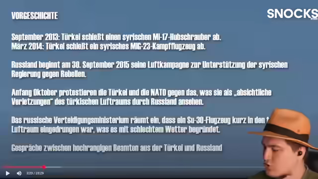 02:09:27Nach dem Abschuss eines russischen Flugzeugs durch die Türkei entbrannte ein Streit um die Deutungshoheit. Russland behauptete, nichts mit dem Vorfall zu tun zu haben, während die Türkei betonte, dass das Flugzeug ihren Luftraum für 17 Sekunden verletzt habe, nachdem es zuvor zehnmal gewarnt wurde. An Bord des Flugzeugs befanden sich zwei russische Militärangehörige, ein Pilot und ein Navigator. Die Türkei veröffentlichte Audioaufnahmen der Warnungen, während Russland dies bestritt. Nach dem Abschuss starteten die Russen eine Such- und Rettungsaktion, bei der ein Hubschrauber unter Beschuss geriet und ein Marineinfanterist getötet wurde. Der iranische General Qasem Soleimani bot seine Hilfe bei der Rettungsaktion an, die mit Unterstützung von Hisbollah-Spezialeinheiten und Eliteeinheiten der syrischen Armee durchgeführt wurde. Der Pilot Oleg Peschkov wurde getötet, während der Navigator Konstantin Murachtin gerettet werden konnte. Der Kommandeur der Brigaden, die den Piloten beschossen hatten, war ein türkischer Staatsbürger namens Alp Arslan Celik, ein Angehöriger der ultranationalistischen Grauen Wölfe. Das Erschießen eines sich mit dem Fallschirm rettenden Piloten verstößt gegen internationales Recht, aber da es sich um eine Miliz innerhalb eines Bürgerkriegs handelte, galten die Genfer Konventionen nicht.