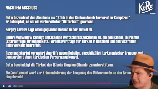 02:19:50Der Vorfall führte nicht zu einem Krieg zwischen der Türkei und Russland, obwohl die Türkei ein NATO-Mitglied ist. Stattdessen versuchte Erdogan, den Einfluss der Türkei durch die Schwäche Russlands zu vergrößern, insbesondere im Kaukasus. Russland reagierte mit einer dringenden Telefonkonferenz zwischen den Außenministern beider Länder, um eine Eskalation zu verhindern. Der russische Außenminister Lawrow kündigte eine Neubewertung der Beziehungen zur Türkei an, und das russische Verteidigungsministerium brach die militärischen Kontakte ab. Russland positionierte S-400 Boden-Luft-Raketensysteme in Syrien und schickte den Lenkwaffenkreuzer Moskwa in die Region. Putin sprach von einem Stich in den Rücken durch Terroristenkomplizen und drohte mit Konsequenzen. Lawrow sagte einen geplanten Besuch in der Türkei ab, und Medvedev kündigte Wirtschaftssanktionen an, die den Tourismus und Arbeitsverträge für türkische Staatsbürger betrafen. Russland flog verstärkt Angriffe gegen Rebellen, einschließlich der turkmenischen Rebellen, und es gab einen Luftangriff auf einen türkischen Konvoi in Syrien, der möglicherweise Waffen lieferte. Putin beschuldigte die Türkei, den Islamischen Staat zu unterstützen, und das russische Parlament brachte einen Gesetzesentwurf ein, der die Leugnung des Völkermords an den Armeniern unter Strafe stellen sollte. Die Türkei verteidigte die Aktion und forderte die NATO auf, sich hinter sie zu stellen.