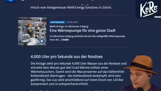 00:50:47In Dänemark ist die weltweit größte Wärmepumpe in Betrieb gegangen, die Meerwasser nutzt, um 100.000 Menschen ohne fossile Brennstoffe mit Wärme zu versorgen. Die Anlage ersetzt ein stillgelegtes Kohlekraftwerk und soll jährlich 280.000 Megawattstunden Wärme für 25.000 Haushalte bereitstellen. Pro Sekunde werden 4.000 Liter Wasser aus der Nordsee entnommen und die Wärme auf das Kältemittel Kohlendioxid übertragen. Der Streamer findet die Anlage eine coole Sache. Es wird erklärt, dass die entzogene Wärme so gering ist, dass sie keine große Auswirkung auf die Meerestemperatur hat. In Köln hat MAN begonnen, eine Flusswasserwärmepumpe zu bauen, die bis zu 50.000 Haushalte versorgen kann. Der Streamer betont, dass deutsche Technik sehr gut ist und Deutschland viele Firmen hat, die bei der Dekarbonisierung eine wichtige Rolle spielen könnten. Solche Wärmepumpen haben einen Vorteil, wenn man sie bei bestehenden Fernwärmenetzen ergänzen kann. Rosenheim nutzt bereits die Abwärme des Mühlbachs. Abschließend wird erwähnt, dass Großwärmepumpen eine sinnvolle Option sind, besonders dort, wo es bereits Fernwärmenetze gibt und Anbieter auf regenerative Energien umstellen wollen.