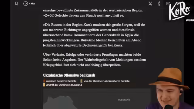 02:06:51Der Streamer spricht über einen Partner namens Koro, der trotz des Namens wenig mit Kernkraft zu tun hat, aber leckere Produkte anbietet. Er wechselt dann das Thema und berichtet über die aktuelle Militäroffensive der ukrainischen Streitkräfte in der russischen Region Kursk, die seit August 2024 andauert. Diese Offensive stellt eine strategische Veränderung im Kriegsverlauf dar und soll möglicherweise als Verhandlungsmasse dienen.