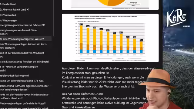 01:49:20Der Wasserverbrauch für die Energiewende wird oft überschätzt. Insbesondere für die Wasserstoffproduktion ist der Bedarf im Vergleich zur konventionellen Energieerzeugung wie Kohle- und Kernkraftwerken sehr gering. Der Wasserverbrauch im Energiesektor sinkt zudem seit 20 Jahren kontinuierlich, da thermische Kraftwerke weniger genutzt werden. Technologien wie Entsalzungsanlagen werden günstiger, wodurch sich der Einsatz in wasserarmen Regionen zukünftig weiter verbessern lässt.