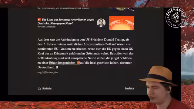 00:19:23Der Stream beginnt mit der Ankündigung des Themas Donald Trump und dessen bizarre Verknüpfung seiner Forderungen nach Grönland mit der Ablehnung des Friedensnobelpreises. Der Streamer erwähnt einen Bloomberg-Artikel über einen Brief Trumps an den norwegischen Premierminister, in dem er erklärt, sich aufgrund der Nobelpreis-Ablehnung nicht mehr an Friedensdenken gebunden zu fühlen und die absolute Kontrolle über Grönland für die USA beansprucht. Diese Aussage wird als absurd und peinlich bewertet.