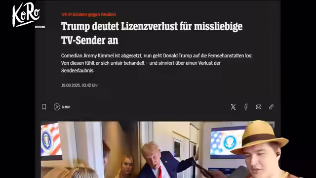 00:41:47Der Streamer äußert sich besorgt über die politische Entwicklung in den USA, die er als zunehmenden Faschismus wahrnimmt. Er kritisiert die Absetzung von Sendungen von Stephen Colbert und Jimmy Kimmel und zieht Parallelen zu Putins Vorgehen in Russland, wo kritische Stimmen unterdrückt wurden. Er fordert, dass Konservative und Rechtsaußen keine Cancel Culture mehr erwähnen dürfen, da sie selbst Meinungsfreiheit einschränken. Er wirft ihnen Scheinheiligkeit vor, da sie unter Biden angeblichen Druck kritisierten, aber Trumps Vorgehen stillschweigend dulden. Tucker Carlson wird zitiert, der sich überraschenderweise gegen die Einschränkung der Meinungsfreiheit ausspricht. Der Streamer kritisiert, dass Jimmy Kimmels Rede falsch zitiert wird und seine Absetzung unbegründet ist. Er sieht darin eine Projektion der eigenen Denkweise. Er vergleicht die Situation in den USA mit Deutschland, wo eine Reporterin des NDR nicht mehr mitmischen soll, und kritisiert den Vergleich mit der Zensur in einem faschistischen Staat als absurd. Er bemängelt, dass viele Leute die Zusammenhänge nicht verstehen und auf Desinformationen hereinfallen, insbesondere im Bezug auf Jugendorganisationen im Rechtsaußenspektrum und Personen wie Charlie Kirk und Nick Fuentes.