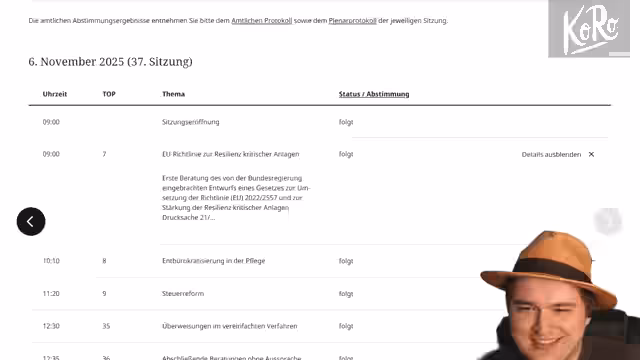 05:44:06Die Diskussion über die Wehrpflicht wird voraussichtlich noch ein bis zwei Wochen andauern, da die Lager im Bundestag verhärtet sind und die erste Lesung des Gesetzesentwurfs sich verzögert. Es wurde ein Ausblick auf zukünftige Stream-Themen gegeben, darunter die Aufarbeitung von Recycling-Regeln und eine kritische Auseinandersetzung mit einem AfD-Antrag zur Windindustrie und Photovoltaik, der als physikalisch inkorrekt erwartet wird. Es wurde angekündigt, dass Ende des Monats oder Anfang November der YouTube-Kanal 'Drakon Reactions' starten wird, der Reaktionen auf aktuelle Themen und aufwändigere Inhalte mit zusätzlichen Quellen bieten soll. Der Kanal soll eine Zusammenfassung für Zuschauer bieten, die nicht täglich live dabei sein können. Es wurde auch auf die Herausforderungen hingewiesen, die mit YouTube-Inhalten und möglichen Sperrungen verbunden sind, und die Notwendigkeit, dies mit einem Cutter zu besprechen. Abschließend wurde der Stream beendet und die Zuschauer zu einem anderen Streamer weitergeleitet, der Pokémon Legends spielt. Der Streamer selbst wird sich im Hintergrund um 'Feuer löschen' kümmern, was metaphorisch für anstehende Aufgaben steht.