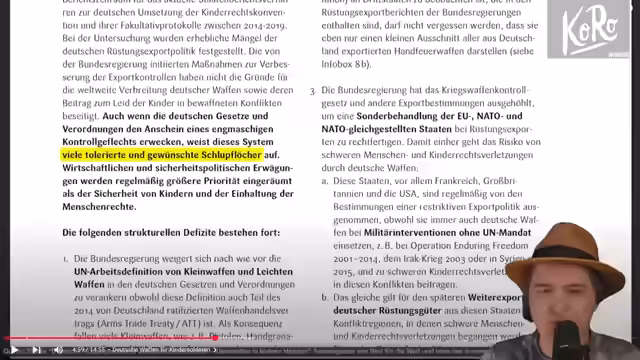 03:07:33Deutschland exportiert seit 2014 Waffen im Wert von über 88 Milliarden Euro, darunter auch Kleinwaffen wie Pistolen und Gewehre. Eine Studie belegt, dass diese Waffen in mindestens acht Ländern mit dokumentierten Kindersoldaten-Einsatz verwendet werden. Diese Waffen sind besonders problematisch, da sie leicht zu handhaben sind. Die deutsche Kontrolle von Waffenexporten wird als mangelhaft beschrieben, was zu einer Mitverantwortung an der Tötung und Verstümmelung von Kindern führt.
