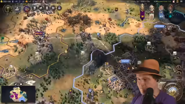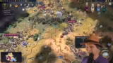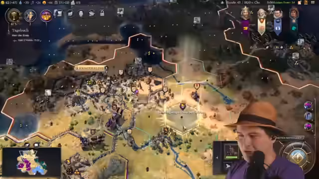 01:03:03Das Spiel gewinnt an Dynamik, als der Streamer feststellt, dass ein Gegner zwei Weltwunder kontrolliert und dadurch einen massiven Vorteil erlangt. Eigene Fehler wie eine niedrige Forschungsrate und fehlende Stadtstaatenboni machen die Situation für ihn schwierig. Er plant daraufhin einen Gegenangriff und mobilisiert seine Truppen, um seine Position zu stabilisieren und die Expansion eines benachbarten Spielers, Sterzig, zu kontrollieren.