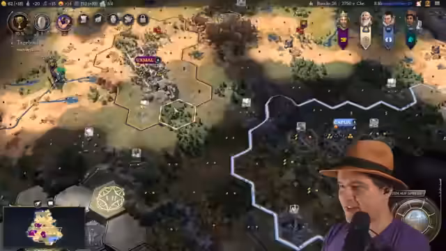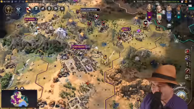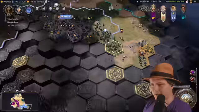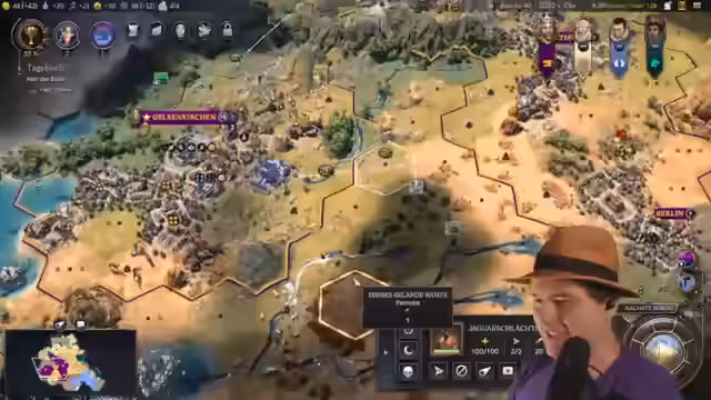 01:28:36Es wird überlegt, ob ein Angriff erfolgen soll, obwohl die Beziehungen gut sind. Die Position wird als ungünstig eingeschätzt, da Stadtstaatenboni fehlen und der Charakter nicht optimal vorbereitet ist. Es gibt Überlegungen zu Städten und geringer Produktion, sowie Nahrungsmangel. Eine Idee wird entwickelt, und es wird geprüft, wie viele Städte andere Spieler haben. Es wird entschieden, zuerst auf Nahrung und Produktion zu setzen, wobei Gold ebenfalls eine Rolle spielt. Mehrere Optionen werden abgewogen und Felder werden gekauft, um Ressourcen zu sichern. Ein Speer wird im Norden positioniert und es wird überlegt, ob die Hauptstadt neben einem Naturwunder liegt. Der Spawnpunkt war nicht schlecht, aber es gab selbstverschuldete Schwierigkeiten. Es wird überlegt, zuerst ein bestimmtes Feld freizuschalten und Speere aufzuteilen, um alles im Blick zu behalten. Der Herrführer kann aktuell wenig machen, und es fällt schwer, Entscheidungen zu treffen. Es wird festgestellt, dass die Forschung schlecht läuft und der Twitch-Chat kurzzeitig verloren ging.