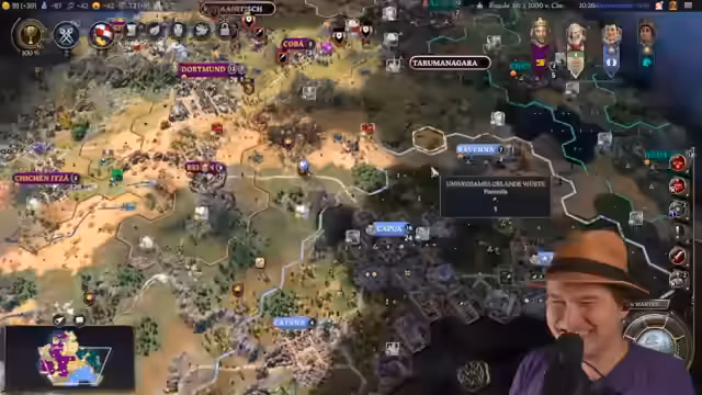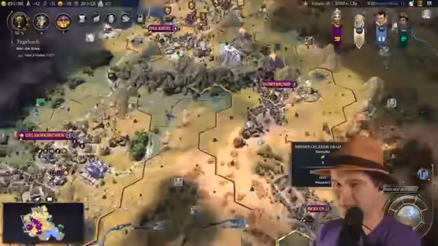 00:49:23Die Phase des spielerischen Machens tritt ein. Der Streamer feiert seinen versuchten, aber gescheiterten Versuch, seine Hauptstadt in 'Gelsenkirchen' umzubenennen, als einen Running Gag im Sinne von Sid Meier. Gleichzeitig trifft der Scout auf eine andere Zivilisation, Konfuzius, was die strategische Situation verkompliziert und die Dringlichkeit unterstreicht, das angestrebte Naturwunder schnell zu sichern.