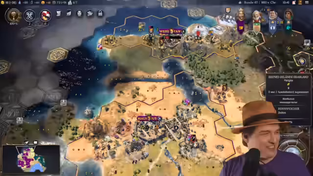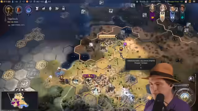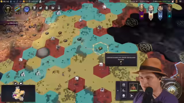 01:44:21Der Streamer analysiert sein Spiel in Sid Meier's Civilization VII und konzentriert sich auf die langfristige Planung. Er betont die extreme Wichtigkeit von Segeln, um seine Expansion voranzutreiben. Nach anfänglichen Fehlern, wie dem Verlust von Happiness und dem Misslingen, einen Berg direkt zu besetzen, plant er den Bau von drei Siedlungen, um diesen Effekt zu kompensieren. Er plant den Bau weiterer Siedlungen wie Dortmund, thematisch passend, und erkundet Ressourcen, um seine Position zu stärken. Das mittelfristige Ziel ist die Vorbereitung auf zukünftige Konflikte und die Sicherung von Ressourcen.