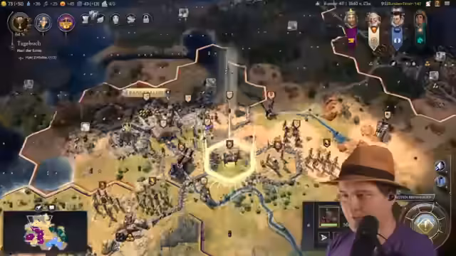 01:15:37Der Streamer versucht, die diplomatischen Beziehungen zu seinen Gegnen zu managen, während er seine Armee für einen potenziellen Kampf vorbereitet. Er überlegt, ob er einen Zwei-Fronten-Krieg riskieren soll, um die Expansion eines aggressiven Spielers zu stoppen. Gleichzeitig muss er seine Ressourcen verwalten, um seine Städte zu stärken und langfristig eine strategische Überlegenheit zu erlangen, während er die Pläne seiner Gegner im Auge behält.