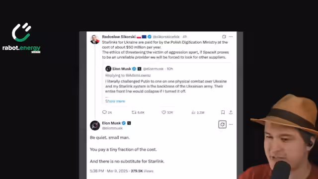 02:13:30Musk kann seine Deals mit Tesla oder SpaceX nutzen, um Einfluss auf Wahlkämpfe zu nehmen. Er hat einem Diplomaten vom polnischen Staat gesagt, dass er ein 'Small Man' sei. Es ging um Starlink, und Musk forderte, dass Europa eine Alternative suchen müsse. Sikorsky hatte gesagt, dass Starlink für die Ukraine vom polnischen Digitalisierungsministerium bezahlt wird. Die ethischen Bedenken, das Opfer mit Aggression zu bedrohen, sind problematisch. Diese Entscheidung könnte dazu führen, dass mehrere europäische Länder Starlink ablehnen. Polen, das Land, das am ehesten das macht, was die USA will, wird behandelt, als wäre es ein Sklave der USA. Es ist unklar, ob Musk den immensen Schaden realisiert, den er anrichtet. Er hat sich eine perfekte Propagandamaschine auf Twitter gebaut, die ein entscheidendes Tool für Trumps Sieg war. Für Trump gibt es keine moralischen Grenzen mehr, auch nicht den Präsidenten eines angegriffenen Staates zu demütigen. Es wird spekuliert, ob es ihm um ukrainische Ressourcen geht, was jedoch als Verschwörungstheorie abgetan wird. Trump geht auf russische Forderungen ein, und Experten befürchten, dass die Ukraine weite Teile ihres Territoriums abgeben muss. Europa muss endlich selbst handeln.