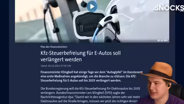 00:41:35Die Bundesregierung plant, die Kfz-Steuerbefreiung für E-Autos bis 2035 zu verlängern, um den Besitz von E-Fahrzeugen attraktiver zu machen. Die Steuerbefreiung soll für Fahrzeuge gelten, die bis zum 31. Dezember 2030 erstmalig zugelassen werden. Der Verband der Automobilindustrie begrüßt diese Maßnahme als wirksamen Kaufanreiz. Der Streamer merkt an, dass die Steuer ein netter Anreiz ist, aber andere Hebel mehr bewirken würden. Er kritisiert die Argumentation, dass durch den sinkenden Verbrenneranteil Geld im Steuertopf fehlen würde, da das Geld ja woanders ausgegeben werde und die Binnennachfrage fördere. Er begrüßt, dass Hybridfahrzeuge nicht gefördert werden und schlägt vor, Subventionen für Diesel oder Benzin abzubauen. Er scherzt, dass er das gesparte Geld eiskalt einsaugt, bevor es im Steuerhaushalt ankommt.