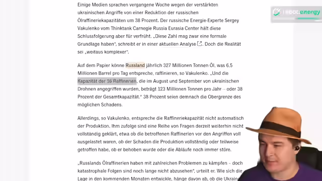 00:46:39Der Streamer geht auf einen Artikel über ukrainische Angriffe in Russland ein und betont, dass Russland auf dem Papier eine große Raffineriekapazität besitzt. Die Angriffe auf Raffinerien haben bereits einen erheblichen Teil dieser Kapazität beeinträchtigt. Es wird jedoch darauf hingewiesen, dass die tatsächlichen Auswirkungen schwer abzuschätzen sind, da unklar ist, wie stark die Schäden sind und ob die betroffenen Raffinerien vor den Angriffen voll ausgelastet waren. Die Tatsache, dass einige Raffinerien mehrfach angegriffen wurden, erschwert Reparaturen. Russland benötigt einen Großteil des raffinierten Öls für die eigene Bevölkerung, und ein Ausfall von mehr als 50% bis 55% würde den Export gefährden. Auch die Angriffe auf Depots tragen zur Verknappung bei. Es wird spekuliert, dass die USA die Ukraine mit Aufklärungsdaten unterstützen, um Angriffe auf Raffinerien und andere Infrastruktur zu erleichtern. Es wird erwähnt, dass Russland plant, die Umsatzsteuer zu erhöhen, um die Spezialmilitäroperation zu finanzieren, was ein Zeichen für die realen Schäden sein könnte.