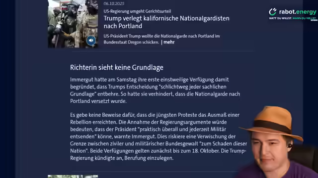 00:54:59Der Streamer berichtet über eine Richterentscheidung, die Trumps Pläne, die Nationalgarde nach Portland zu schicken, blockiert. Die Richterin begründete ihre Entscheidung damit, dass es keine sachliche Grundlage für Trumps Annahme gäbe, dass die Proteste in Portland das Ausmaß einer Rebellion erreicht hätten. Sie warnte vor einer Verwischung der Grenzen zwischen ziviler und militärischer Bundesgewalt. Es wird spekuliert, dass Trump möglicherweise veraltete Aufnahmen von Ausschreitungen in Portland im Fernsehen sieht und deshalb glaubt, er müsse das Militär schicken. Es wird auch die Möglichkeit erwähnt, dass Berater Trumps Interesse daran haben könnten, Druck aufzubauen. Der Streamer äußert die Sorge, dass man Trump bald eine KI-Version von Pearl Harbor zeigen könnte. Es wird spekuliert, dass Trump möglicherweise von den Epstein-Akten ablenken möchte. Politiker aus Oregon widersprechen Trumps Darstellung der Lage in Portland und betonen, dass die Stadt friedlich sei und es keine Notwendigkeit für eine militärische Intervention gebe.