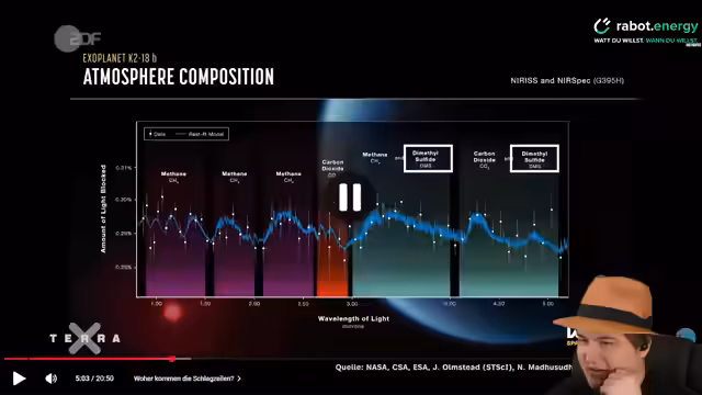 02:21:05Es wird eine kritische Diskussion über die Veröffentlichung von Forschungsergebnissen zu Biosignaturen auf dem Exoplaneten K2-18b geführt. Die Erstautoren der Studie, darunter Nico Matusudan von der University of Cambridge, behaupten, Hinweise auf Dimethylsulfid (DMS) gefunden zu haben, ein Molekül, das auf der Erde von Algen produziert wird und als Biosignatur gilt. Die University of Cambridge hat dies prominent angekündigt, was eine große öffentliche Reaktion hervorrief. Jedoch wird die wissenschaftliche Methodik und die statistische Qualität der Daten hinterfragt. Es wird bemängelt, dass die Studie möglicherweise überinterpretiert wurde und die Datenlage die spektakulären Schlussfolgerungen nicht vollständig stützt. Die Annahme, dass DMS auf K2-18b zwangsläufig Leben bedeutet, wird kritisch beleuchtet, da dieses Molekül auch auf Kometen ohne biologischen Ursprung gefunden wurde.