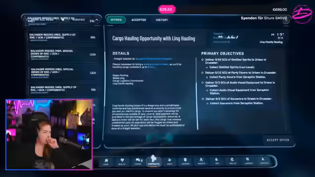 00:06:59Die Streamerin erwähnt das bevorstehende Update 4.8 für den PTU (Public Test Universe), dessen Wave 1 bald erscheinen soll. Sie diskutiert Veränderungen im Spiel, wie das Verschwinden von Ärzten und mögliche Auswirkungen auf den Bergbau. Es gibt auch Diskussionen über illegale Quests wie die Antium-Rüstung und Mercenary-Aufträge, die das Gameplay erweitern. Währenddessen kämpft sie mit Bugs und Serverproblemen, die das Einstellen von Routen und das Springen zwischen Systemen beeinträchtigen.